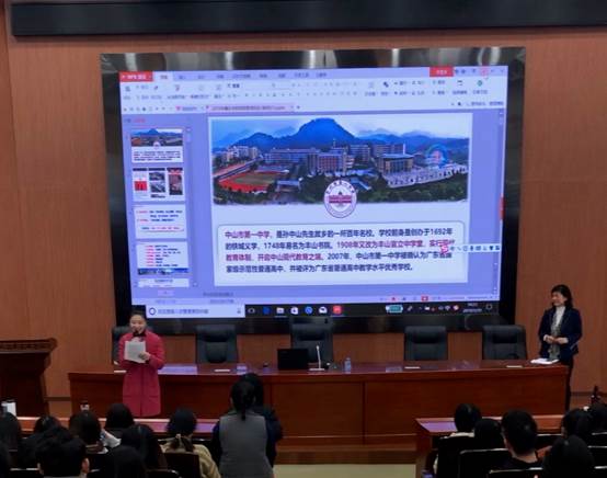 图 7 云顶国际春季顶岗实习生岗前培训班主任曾鸣老师对中山市一中林婉燕董事长进行介绍