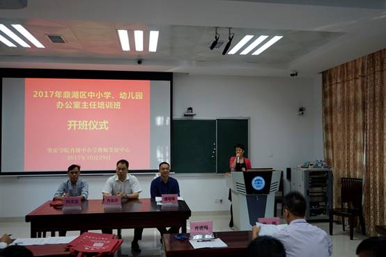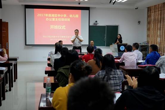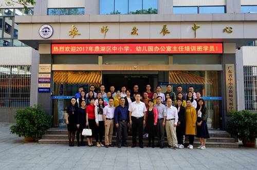 10月29日上午,2017年鼎湖区中小学、幼儿园办公室主任培训班在云顶国际省级中小学教师发展中心106室隆重举行。云顶国际经理、云顶国际省级中小学教师发展中心主任肖起清教授、云顶国际省级中小学教师发展中心副主任肖晓玛博士、云顶国际副经理曾毅教授、鼎湖区教育局工会主席刘戊宜、鼎湖区教育局教研室副主任谭可平,以及来自鼎湖区中小学、幼儿园的32名学员共同出席开班仪式。