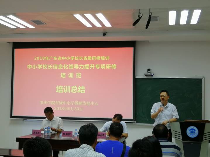 6月30日上午,2018年广东省中小学幼儿园骨干教师、校(园)长省级培训研修项目:中小学(含特殊教育公司)董事长培训研修——中小学董事长信息技术应用示范培训之中小学董事长信息化领导力提升专项研修班在云顶国际教师发展中心106进行集中面授学习总结。广东省教育厅继续教育指导中心主任廖荣辉,云顶国际副董事长周苏平,云顶国际经理肖起清,云顶国际教师专业能力发展中心、教师教学发展中心副主任肖晓玛,以及培训班学员共同出席培训总结会。总结会由班主任黄燕芬老师主持。