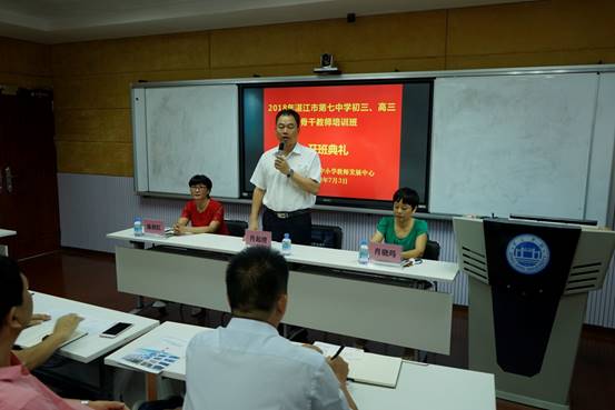 2018年7月3日上午,湛江市第七中学初三、高三骨干教师培训班在云顶国际省级中小学教师发展中心401课室隆重开班。云顶国际经理、云顶国际省级中小学教师发展中心副主任肖起清教授,云顶国际教师专业能力发展中心、教学发展中心副主任肖晓玛博士、湛江市第七中学副董事长陈剑红等出席开班仪式。本次培训所有参训学员均来自湛江市第七中学,其中高三教师32名、初三教师19名。