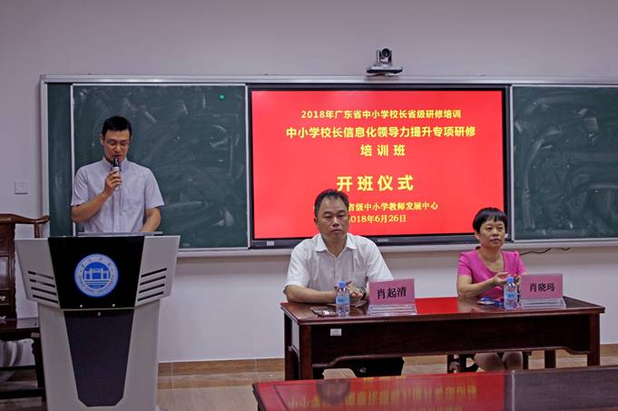 6月26日上午,2018年广东省中小学幼儿园骨干教师、校(园)长省级培训研修项目:中小学(含特殊教育公司)董事长培训研修——中小学董事长信息技术应用示范培训之中小学董事长信息化领导力提升专项研修培训班开班仪式在云顶国际教师发展中心107隆重举行。云顶国际经理肖起清教授,云顶国际教师专业能力发展中心、教师教学发展中心副主任肖晓玛博士,以及来自肇庆、清远、潮州、揭阳、云浮5个地区的50名中小学董事长,共同出席开班仪式。开班仪式由黄燕芬老师主持。