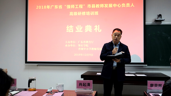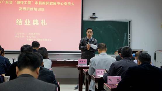 最后,廖荣辉主任发表重要讲话。廖主任高度肯定了此次培训的成效:课程安排合理,团队力量雄厚,学员学习认真。廖主任对市县教师发展中心建设工作做了重要部署,着重强调以下几点:1、逐步推进、因地制宜,机构整合不强求统一模式,在建设过程中多进行专题论证,积极推动建设工作。2、理清思路、完善方案、优化资源整合。3、敢于担当,在省厅推动下,学会助推自身,且借力其他机构与部门的资源,争取2019年8月,顺利通过绩效考核。4、加强质量监控,在培训项目开展过程中,切记不要选择“无证件、无场地、无食宿的三无机构”作为培训项目实施机构。5、努力做到几个新目标:健全培训体系;培育省市县三级体系的名师、名董事长工作室主持人、展开五年360学时精准培训、培育专业发展公司;拟定分科分类课程指南;展开培训“新管理”、建设信息化管理平台;设置培训指南与项目指南;引入第三方,对所有培训项目进行现场抽查,展开“新评估”。